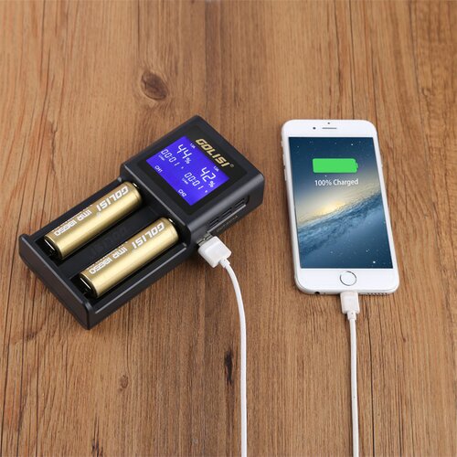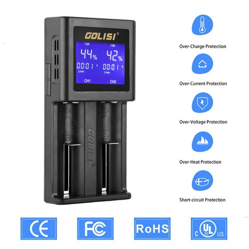 Das S2 Ladegerät aus der Smart-Serie von Golisi ist ein hochintelligentes 2-Schacht-Ladegerät mit integriertem, gut lesbaren HD-LCD-Display. Es lädt nahezu jede Art von Batterien mittels automatischer, elektronischer Erkennung schonend und sicher auf. Auf dem Display lässt sich der aktuelle Stand des Ladevorgangs präzise ablesen und es kann zwischen Spannung, Kapazität und verbleibender Ladezeit gewählt werden. Ein zusätzlicher, seitlich angebrachter USB-Anschluss kann als Art Powerbank genutzt werden. Einer der Slots, gekennzeichnet mit 2A, kann als 2A-Schnellladeslot verwendet werden.